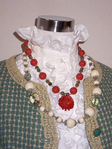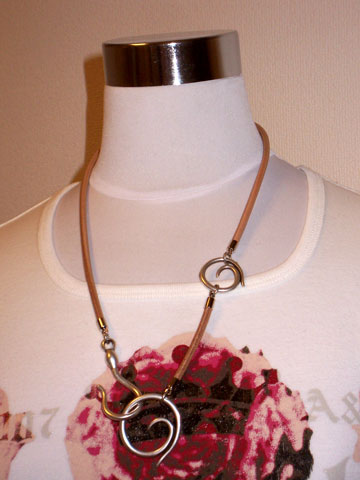 パーツの面白さが命のペンダント (この長さじゃチョーカーとは呼べないね)。大小の渦巻きと大きなフックはギリシャ製だとか。革紐を切って瞬間接着剤で金具とくっつけただけのお手軽アクセですが、こういうシンプルな品は普段使いにとっても重宝します。