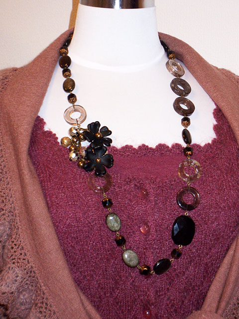 今回一番作りたかったのはこれ。流行のロングネックレスは質感がイマイチの物が多く、ちゃんとした物は5桁を超えるお値段がついてることも。そんなわけで自分で作ってしまいました。オフホワイトのアクリルビーズは大小共にドイツ製。少し小さい透明ビーズはイタリア製、大粒のビーズはチェコ多面カットで材料費結構かかってます。あと1つ1つの粒に花座をつけたのも財布に痛かった…。まだまだ9ピン繋ぎは下手くそですがアシンメトリーデザインが結構気に入ってます。