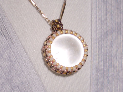 今回は丸小・特小・チェコシードビーズだけ。花編みだとサイズ調整が難しいので8の字編みです。最初は石が抜けるんじゃないかと不安でしたが、奇跡的にぴったりで全然落ちる気配がありません (中でくるくる回るけど)。石は写真だと何だかパールみたいですが中にクラッキングも少々存在する歴とした水晶です。作ってて思ったんだけど透明のボールがどーんと来るモチーフって Vivienne Westwood ぽくない!? (←かなり強気発言) チェーンは別のペンダント (既製品) から借りてます。後で似合うチェーンを見つくろう予定。私の作るペンダントトップはボールチェーンが一番無難のような気がする。あ、大きいトップだから長目の革紐もいいかも!