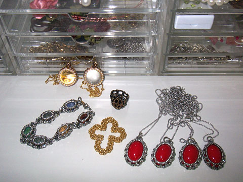 この前いくつかまとめてアップしましたが、それから増えた品を (一部紹介済み)。夏コミで販売する予定の例のペンダント4つ、カボションモチーフを6つ繋げたブレスレット、静哉さんレシピのリング&十字架モチーフ、そしてお友達にプレゼントしようと思って作った水晶玉のペンダントです。左は先日紹介した自分用で、チェーンが透けてるので金色に見えてます。