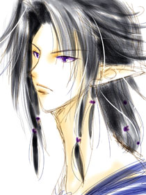 過去キャラのうち汞・燐・那由他の3人は髪の毛が肩辺りで似たような長さしています。私が一番好きな長さなので…済みません。魔術師と吟遊詩人は私の中で胡散臭い系職業の No.1 を争っていて、その意味では翡翠&那由他は胡散臭兄弟ということになるのでしょう (笑)。で、魔術師はストレートの長髪じゃなきゃいけなくて、吟遊詩人は同じくストレート長髪かもしくは髪の毛を細かく編んだり結ったり凝っているというイメージなのです。あ、描き忘れた! こいつは耳の先端にリングピアスをぶら下げているという設定です。小さいリングをじゃらじゃら何個も着けてる感じ。